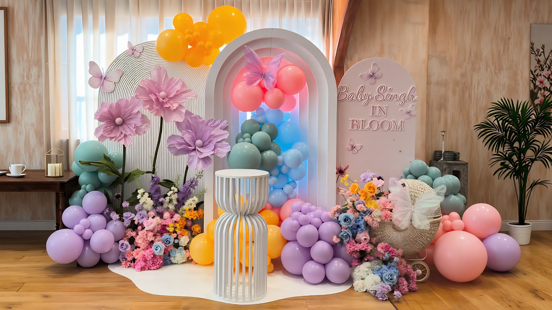 baby in bloom baby shower setup with floral decorations and pastel accents by Colourful Treasures